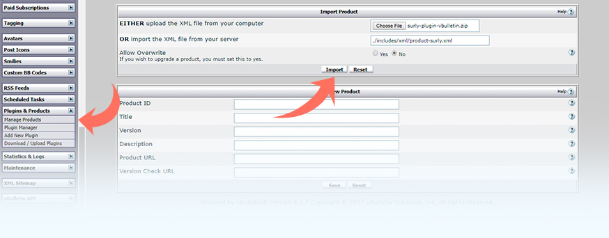 Go to Plugins & Products → Manage Products. Click Import Product. In the Import Product dialog, enter the path to the XML file: ./includes/xml/product-surly.xml and click Import
